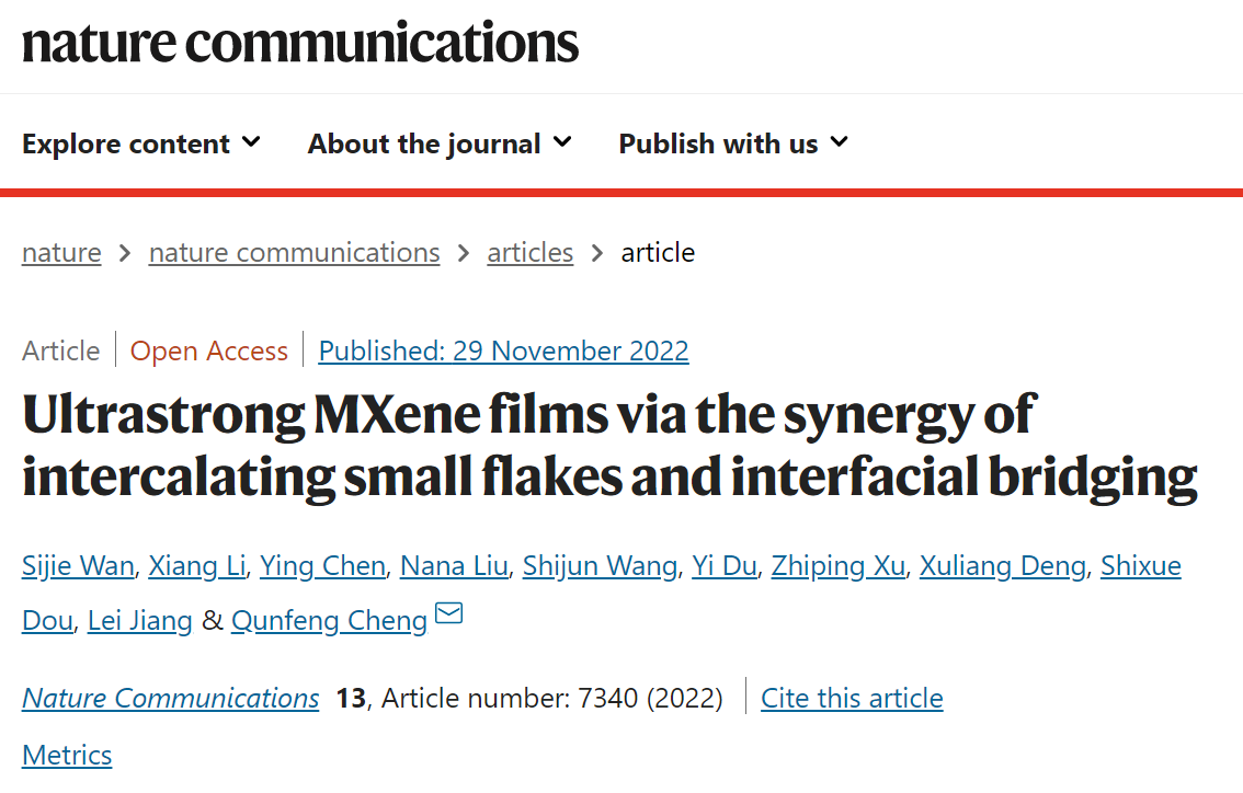 2022年11月29日,《Nature Communications》在线刊登了pp电子模拟器官网pp电子模拟器官网程群峰教授课题组的最新研究成果“小片填充和界面交联协同致密化的超强MXene薄膜”(英译:Ultrastrong MXene films via the synergy of intercalating small flakes and interfacial bridging),pp电子模拟器官网pp电子模拟器官网万思杰副教授、李响、北大口腔医院第一门诊部陈英博士、pp电子模拟器官网物理学院刘娜娜博士为第一作者,程群峰教授为通讯作者,pp电子模拟器官网pp电子模拟器官网为第一完成单位。