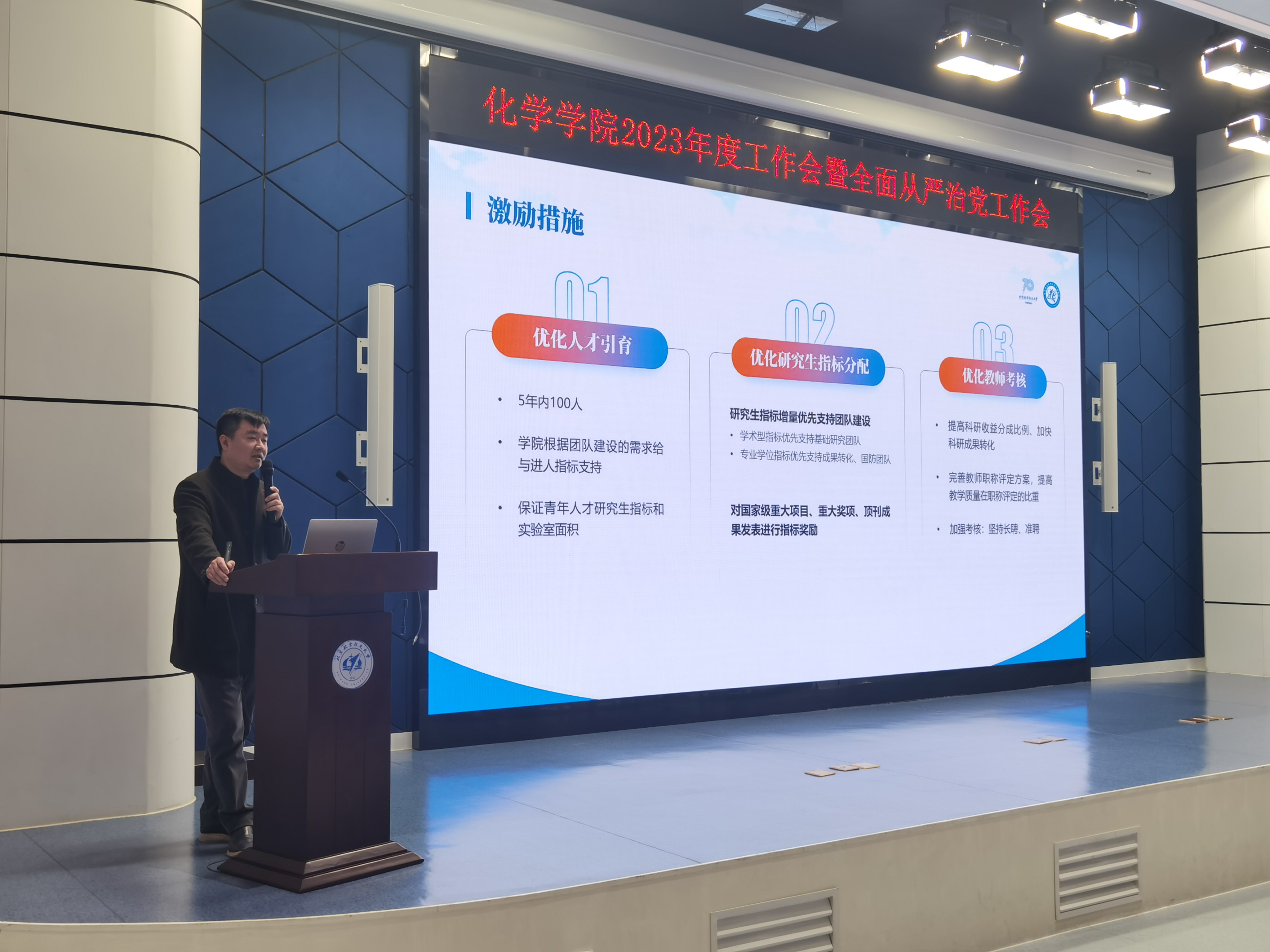 刘明杰院长传达了学校2023年度工作会暨第九届教职工代表大会第四次会议精神,对学院2022年工作成绩进行总结,并依据学校工作总体要求及重点工作,对学院2023年重点工作进行部署。