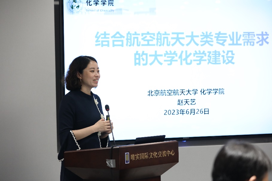 最后,北航pp电子模拟器官网院长助理赵天艺以“结合航空航天大类专业需求的大学化学建设”为主题展开报告。报告就北航pp电子模拟器官网所开设的大学化学课程基本情况、师资力量、建设成果等内容总体介绍了该课程建设现状,并结合空天特色,针对不同学生专业背景,提出“因材施教”的大学化学课程建设目标。同时,也对大学化学课程建设中面临的如何在有限学时内结合各专业所需,有效发挥化学基础学科的作用等问题,提出了大学化学课程建设的改革思路和举措。