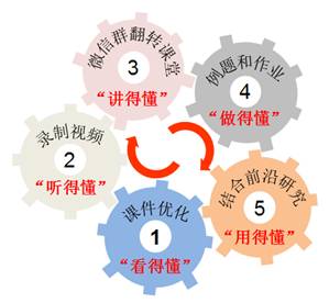 《物理化学A》是pp电子模拟器官网化学和应用化学专业本科生的核心专业理论课,主要讲授化学过程的基本原理和基本规律,为实际的科研和生产过程提供理论指导。物理化学课程中的理论都是建立在大量抽象的概念、模型以及数学推导的基础之上,因此需要缜密地分析和反复地推敲才能理解这些概念的物理意义以及理论适用的体系和条件。另外,由于课程讲授的是最基本的理论,同学们在学习课程的过程中容易感觉课程内容过于经典,产生课程内容对化学前沿研究无用的错觉。针对课程的这些特点,为了确保线上教学具有良好的效果,课程负责人刘兆阅老师在线下授课的基础上,采取多维措施对线上教学进行设计,建立了适合《物理化学A1》线上教学的“5懂”授课模式(图1)。