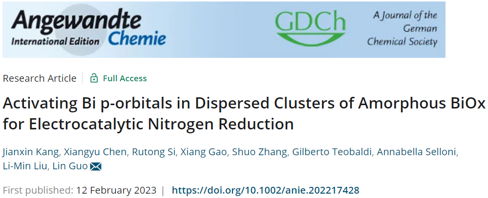 近日,pp电子模拟器官网郭林教授和物理学院刘利民教授研究团队在高度分散的原子级非晶BiOx团簇可控制备及其电催化氮气还原反应方面取得新进展。相关工作以“Activating Bi p-orbitals in Dispersed Clusters of Amorphous BiOx for Electrocatalytic Nitrogen Reduction”为题,2023年2月12日在线发表在《Angewandte Chemie International Edition》杂志上。该研究获国家自然科学基金项目(No. 51532001, 11974037)等资助。pp电子模拟器官网副教授康建新为文章的第一作者,pp电子模拟器官网博士生陈翔宇和北京计算科学研究中心博士生司如同为共同一作,pp电子模拟器官网为该论文的第一完成单位。