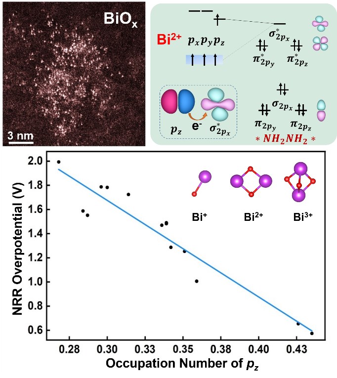该项研究工作揭示了非晶BiOx团簇6p轨道占据数的调控引起的Bi氧化态的变化与氮还原反应的活性及选择性间的内在联系,为进一步开发基于p轨道的主族金属基催化剂提供了借鉴。