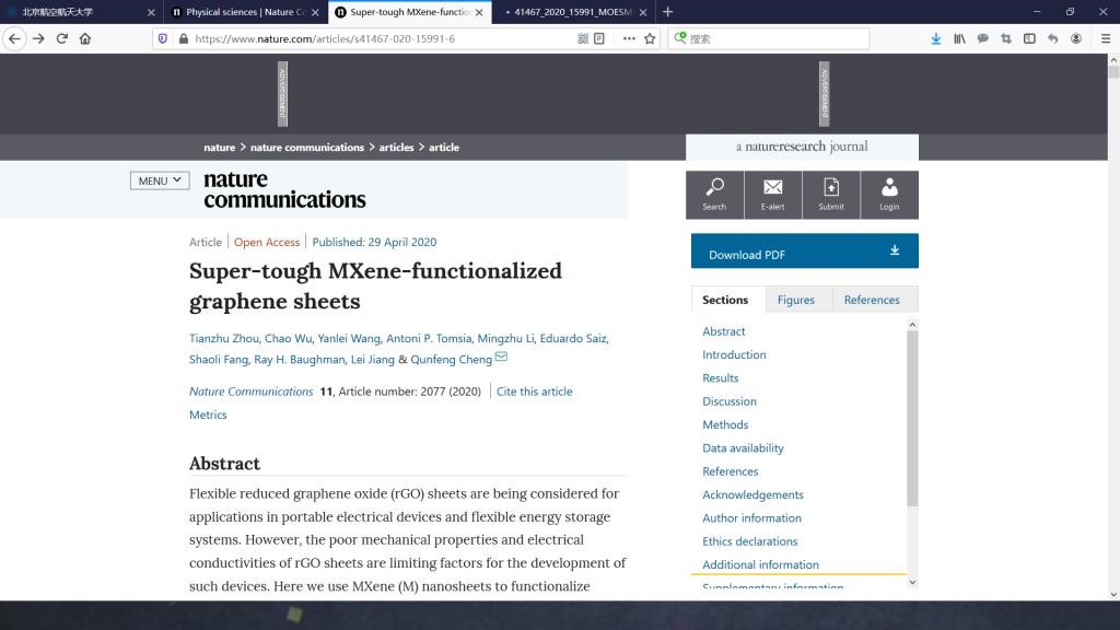 2020429日,Nature Communications杂志以在线全文Article的形式发表了pp电子模拟器官网程群峰教授课题组在超韧材料的最新研究成果“Super-tough MXene-functionalized graphene sheets”。周天柱博士、吴超教授、王艳磊副研究员为第一作者,程群峰教授为通讯作者,pp电子模拟器官网pp电子模拟器官网为第一完成单位。