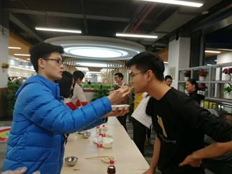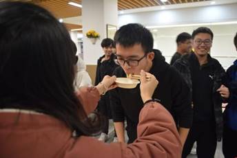 在第一锅饺子出锅后,我们的第一个游戏便开始了。首先我们进行的是抢水瓶游戏,pp电子模拟器官网的导员黄澄玉和丁少松同学给大家做了一个示范,主持人说出一个身体的部位,两人分别摸自己的相应部位,在主持人说出“水”这个字的时候,两个人同时去抢桌子上的水瓶,但是黄导更快一步,于是作为输了游戏的人要被黄导喂五个饺子,场景太有爱了。之后同学们也积极加入到这个游戏中来,这也是一个很幸福的游戏了。