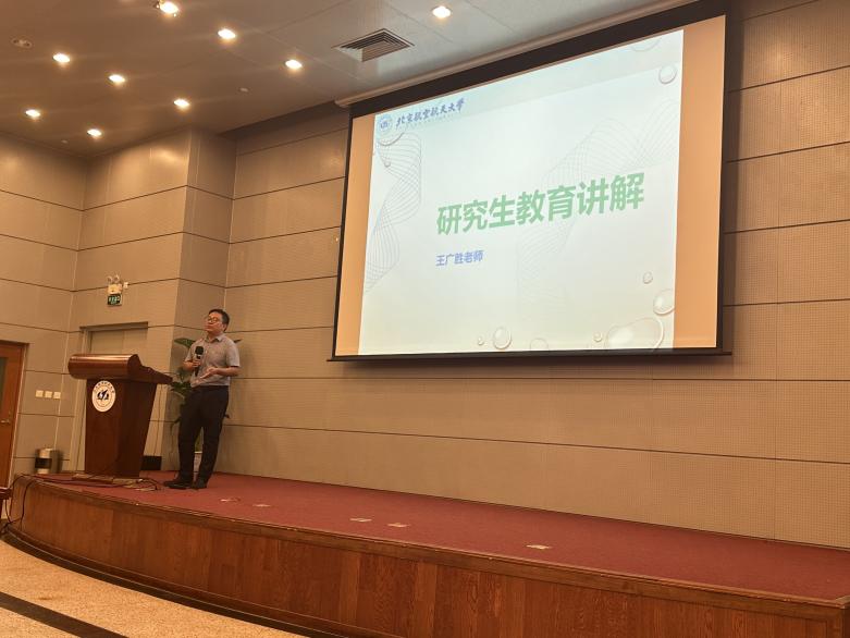 研究生教学副院长王广胜老师对新生表示欢迎和祝贺。王老师从学习、生活、科研等方面向同学们提出了宝贵的建议。首先王老师希望同学们对学校和老师心怀感恩,珍惜学校和老师们为我们提供的机会与平台。此外王老师还通过自己的亲身经历和心得,语重心长地提醒各位同学坚持不懈,恪守初心。最后王老师期待各位同学能把握研究生阶段的宝贵时间,活出属于自己的模样!